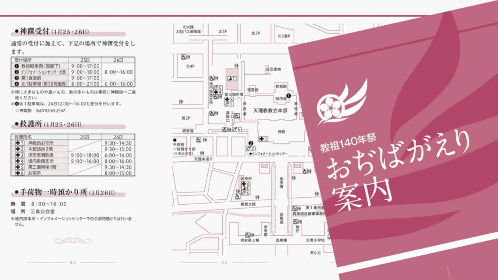 「おぢばがえり案内」と帰参者用チラシ(おやさとマップ) このほど、2カ月後に迫った教祖140年祭の“帰参者向けガイド”として、「おぢばがえり案内」と帰参者用チラシ(おやさとマップ)が配布された。 「お・・・