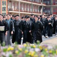 式後、心地よい春の陽気のなか、卒業生たちは本部神殿へお礼参拝に向かった。