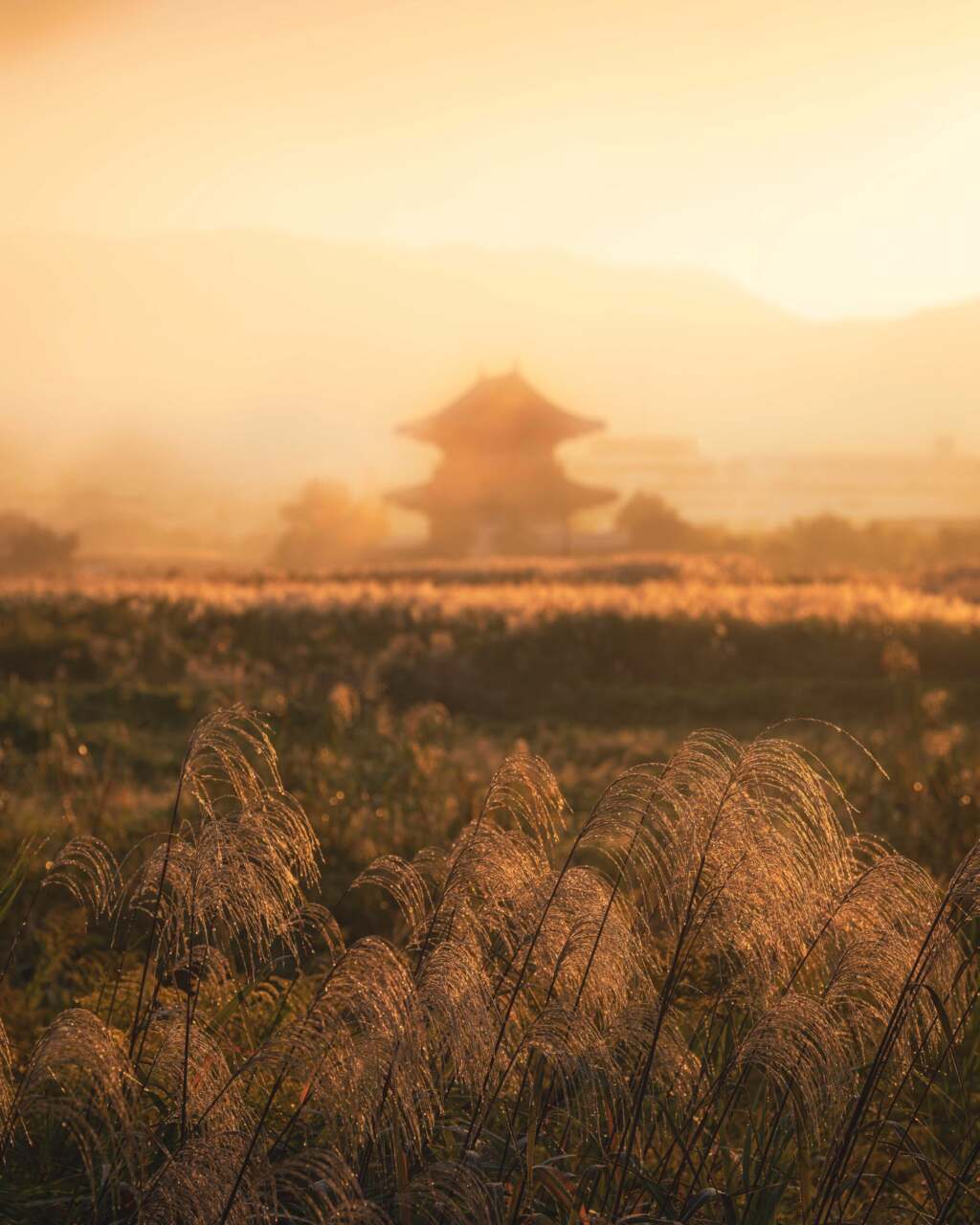 奈良市の平城宮跡歴史公園。冷え込む早朝、秋の気配を感じるススキの穂に光が射し込む。すると周囲が朝霧に包まれた。 by 藤浪秀明