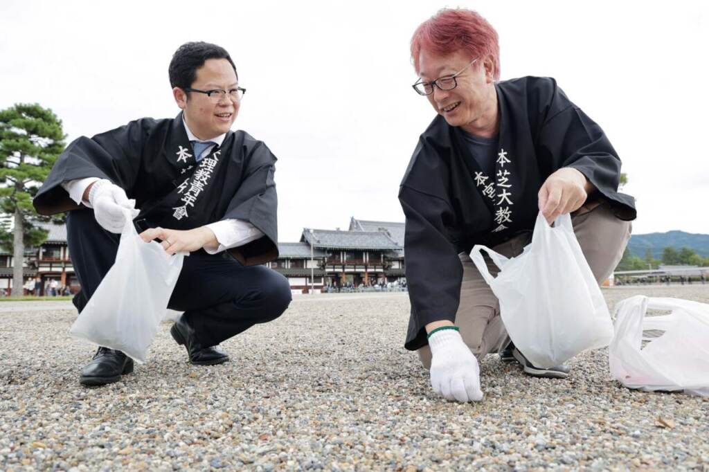 25日午後、西境内地で丹念に除草作業に努めていたのは下平昇さん(67歳・信濃龍西分教会ようぼく・長野県飯田市)。伊那大教会(萱間元一会長・同市)が25、26の両日に実施した「伊那大教会一斉おぢばがえり」に夫婦で参加した。
