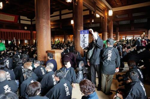 午前11時半、同団参に参加した教友たちが、本部神殿東・西・北の各礼拝場でおつとめを勤めた。