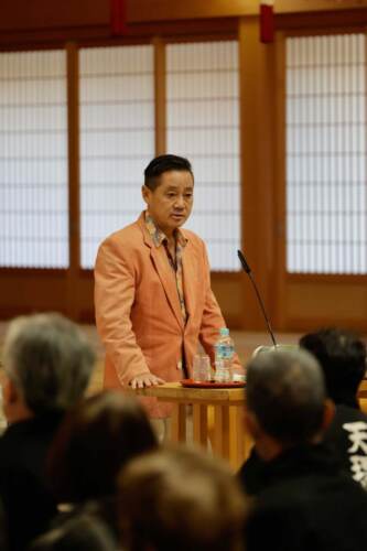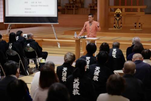 講話に熱心に耳を傾けていた藤野浩さん(55歳・理眞分教会理福布教所教人・広島市)は、年祭活動1年目に、家庭の事情から精神的に落ち込んでいた教友Aさんのたすかりを願い、3年間で1000回のにをいがけ実動を行うことを心に定めた。仕事終わりに駅前などで路傍講演や神名流しを心がけ、現在までに900回の実動を続けてきた。