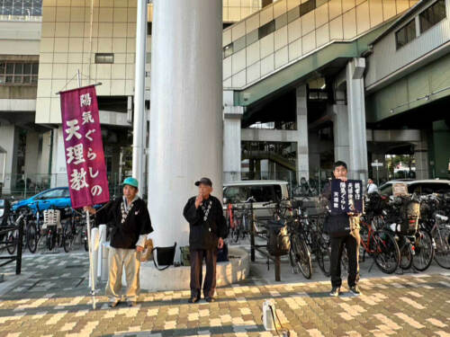 11月7日午後4時すぎ、大阪市の弁天町駅付近の高架下で、大阪教区中央西支部(竹川東一郎支部長)の教友たちが、行き交う人々に向かってお道の教えの一端を語りかけていた。