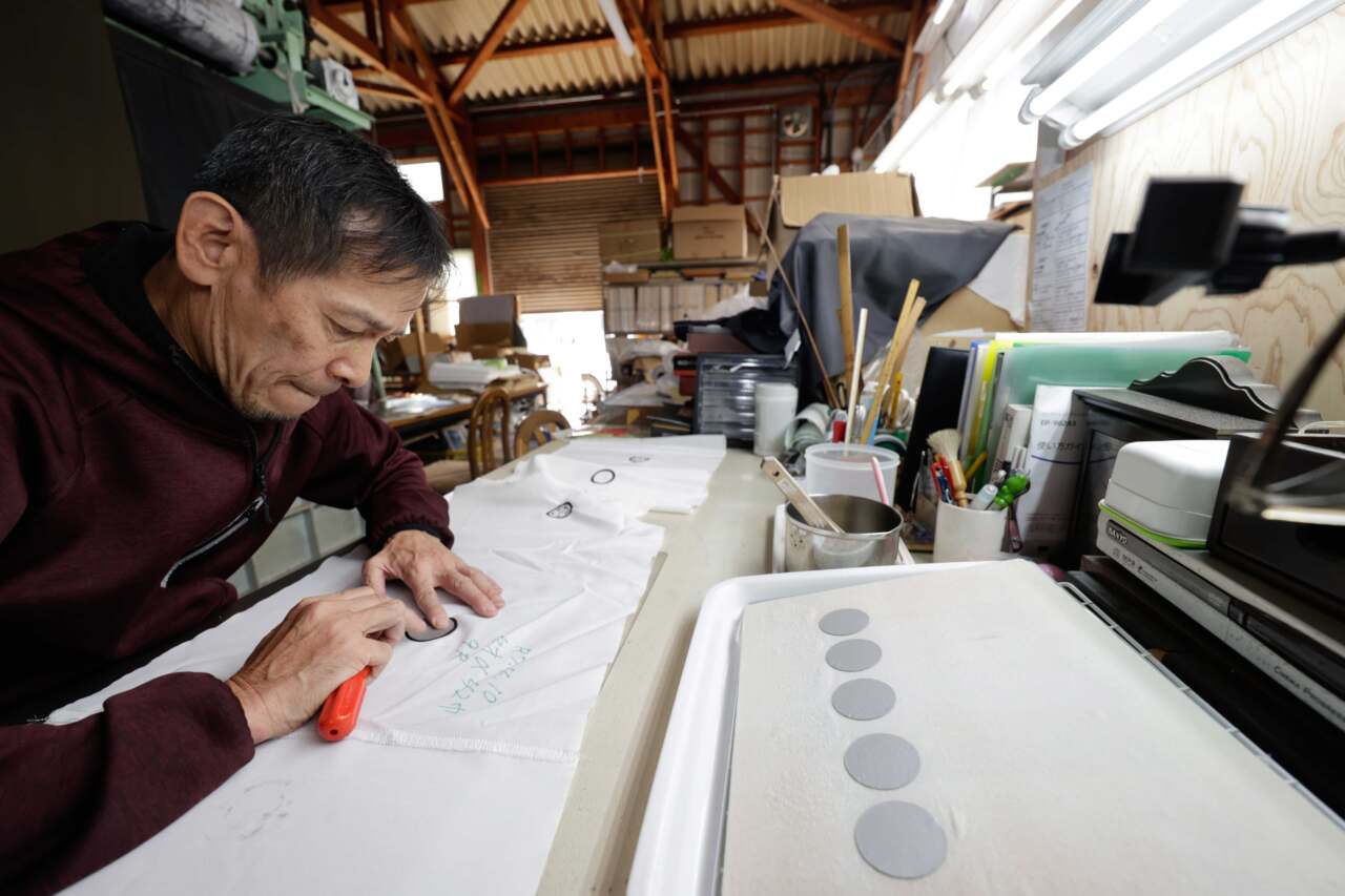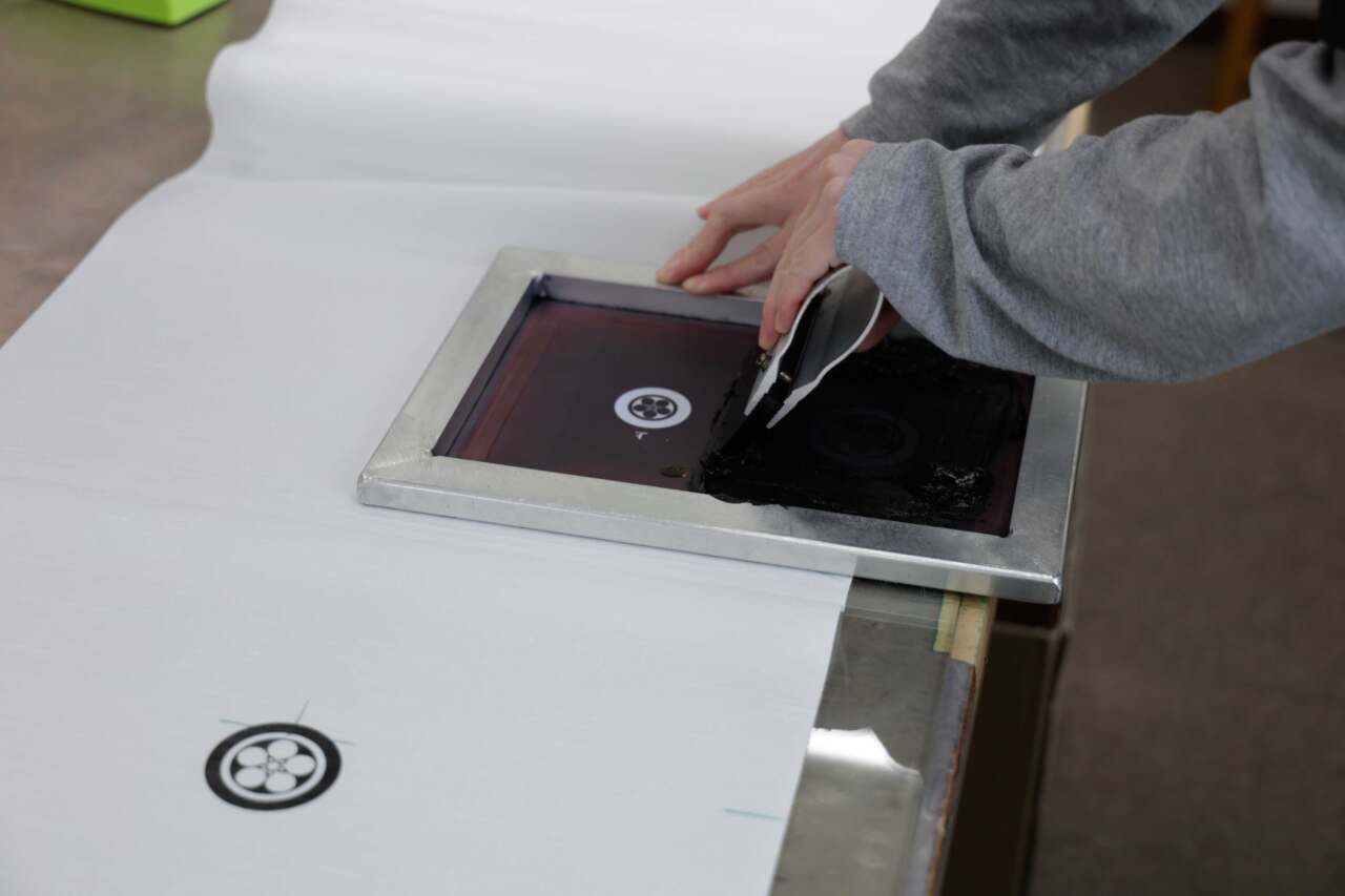 スミ打ちを終えた生地は、次の「上絵」の工程で、スクリーンと呼ばれる紋型とヘラを使ってスミ打ちをした場所に梅鉢の紋が刷り込まれる。この作業も辻さんが担い、慣れた手つきで1着につき6カ所、梅鉢の紋を刷り込んでいく。