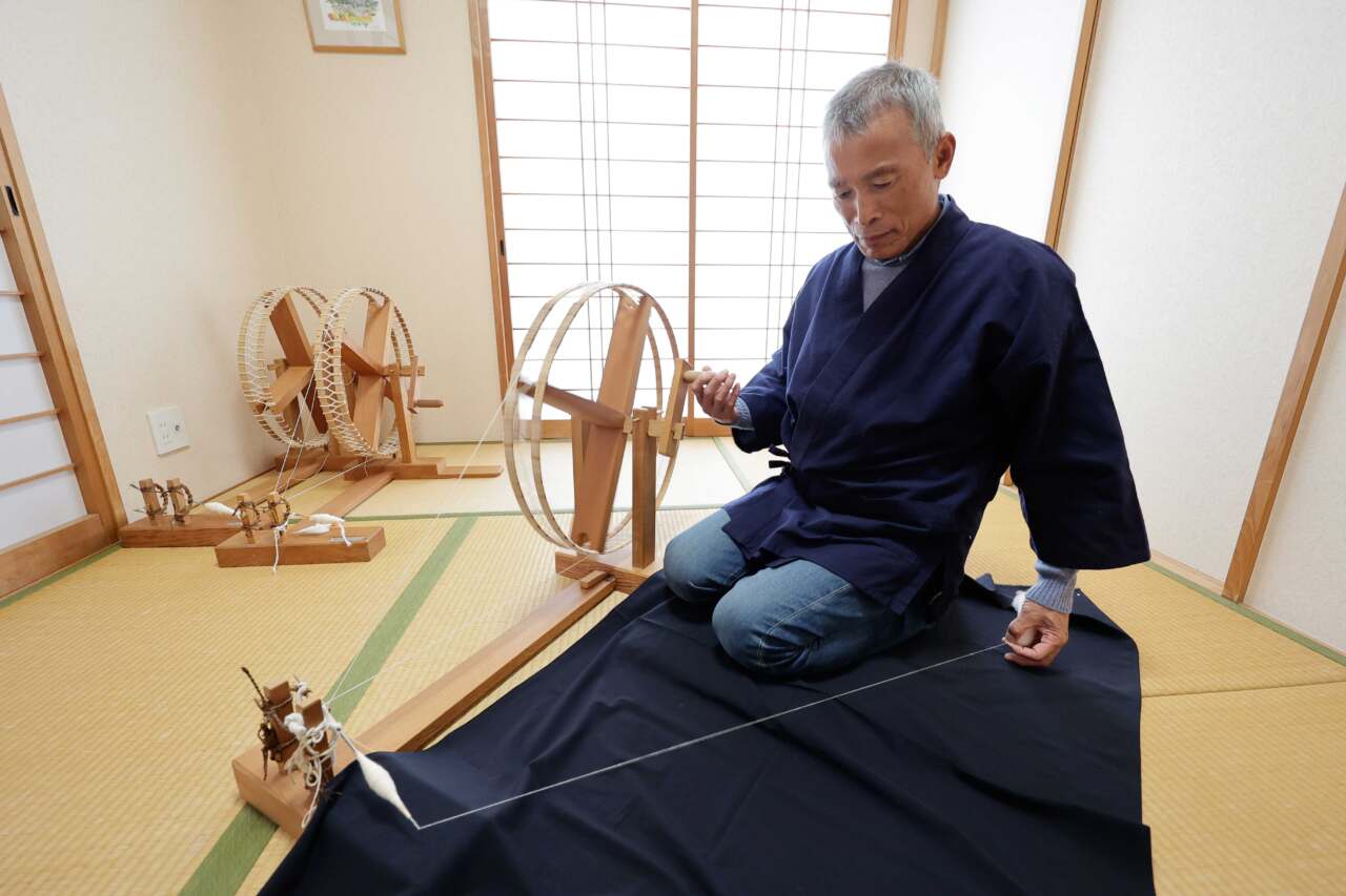糸を紡ぐ道具には糸車、チャルカ、スピンドル、タクリなどと呼ばれるさまざまなタイプがあり、江戸時代に一般的に用いられたのは手回し式の木製糸車です。土台、車輪、細い棒状の紡錘と糸(はや糸、ベルト)だけの単純な構造です。車輪を1回転させると紡錘が60~80回転し、その紡錘先に糸を滑らせることによって繊維に撚りをかけていきます。右手で車輪を回し、左手でジンキを引いていきます。右手と左手のバランスで糸の太さ、強度をコントロールします。上手に紡ぐには熟練を要するものの、慣れると単純な反復運動が心地よくもあります。