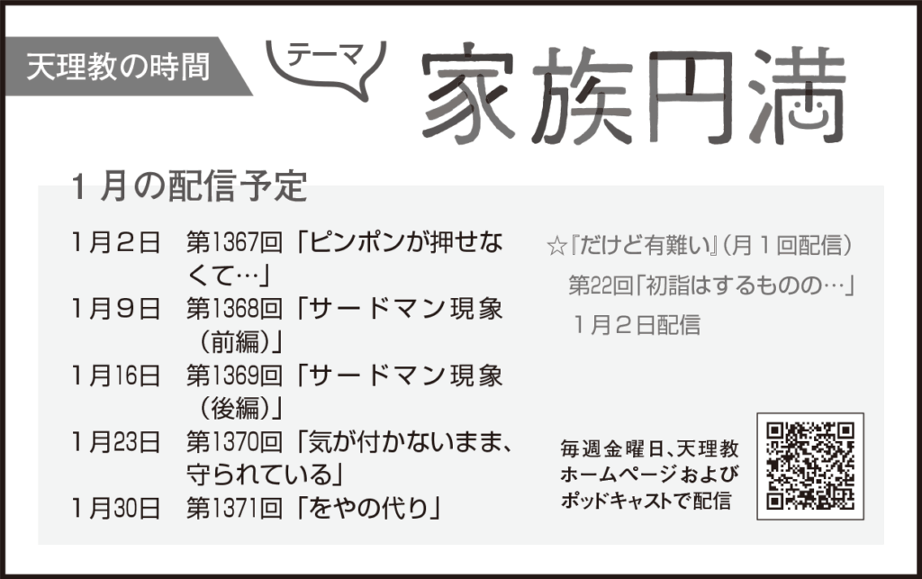 元旦祭1日午前5時 本部神殿 鏡開き4日午前8時30分 西礼拝場 別席別席は2日午前8時から平常通り、おやさとやかた東左第1棟で受け付けます。※なお、年末12月28日から1月1日までの別席はございませ・・・