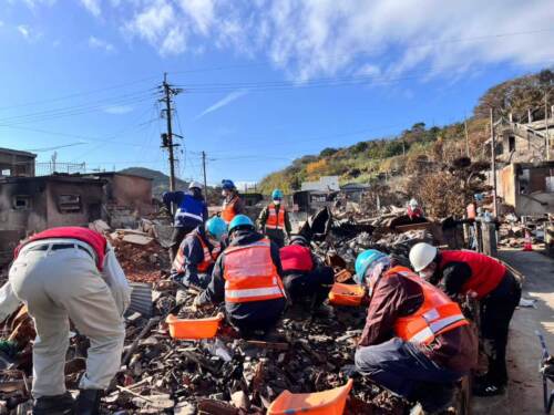 2025年11月18日夕方、大分市佐賀関の住宅地で火災が発生。佐賀関半島の港町を中心に住宅など187棟が焼損し、焼失面積は約4万8900平方メートルに及んだ。こうしたなか、災害救援ひのきしん隊(=災救隊)大分教区隊(千原松太郎隊長)は、大分市社会福祉協議会(=社協)から要請を受け、昨年12月12日から大規模火災の現場へ出動。被災民家のブルーシート張りなどの復旧作業に力を尽くした。