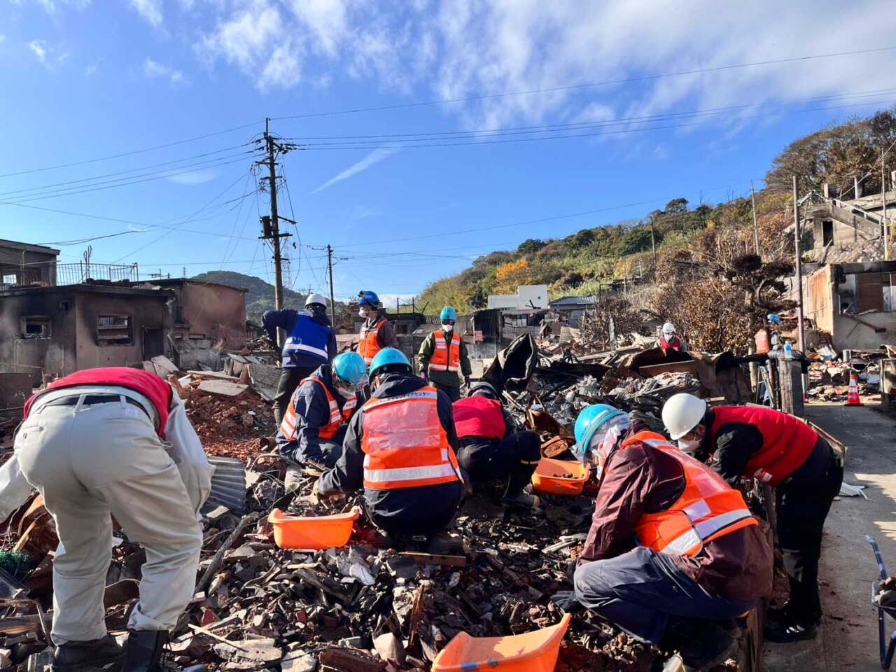 第3次隊の隊員5人は19日に出動。一般ボランティアと共に、のこぎりなどを使用した焼けた竹藪の伐採や、被災民家から思い出の品を取り出しやすくするための里道の啓開作業に力を尽くしたほか、被災者の親族の立ち合いのもと「思い出の品の捜索」に協力した。
