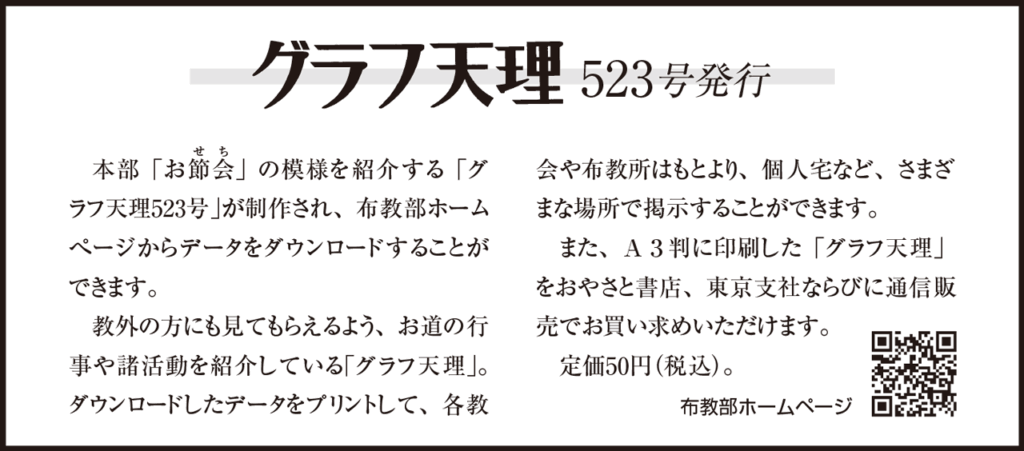 教祖140年祭を目前に控えるなか、年祭をより広く周知し、一人でも多くの人に帰参してもらおうと、年祭を告知するポスターをJRや近鉄、阪神の主要駅に掲示するとともに、デジタルサイネージ(電子看板)を利用し・・・