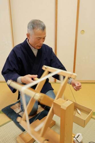 糸車を用いて紡いだ糸は、綛上げ機と呼ばれる道具を使って輪状の束にします。綛あるいは綛糸とは、糸の保管や輸送、染色などの工程をしやすくするために、糸が絡まないように細い紐で結んだ輪状の糸束のことです。手紡ぎをした糸を綛にする工程が綛上げです。