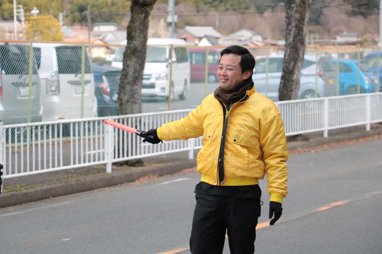 1月25日、小林裕樹さん(40歳・崎新道分教会長後継者・東京都練馬区)は、北大路で交通整理の「特別ひのきしん」に勤しむ。