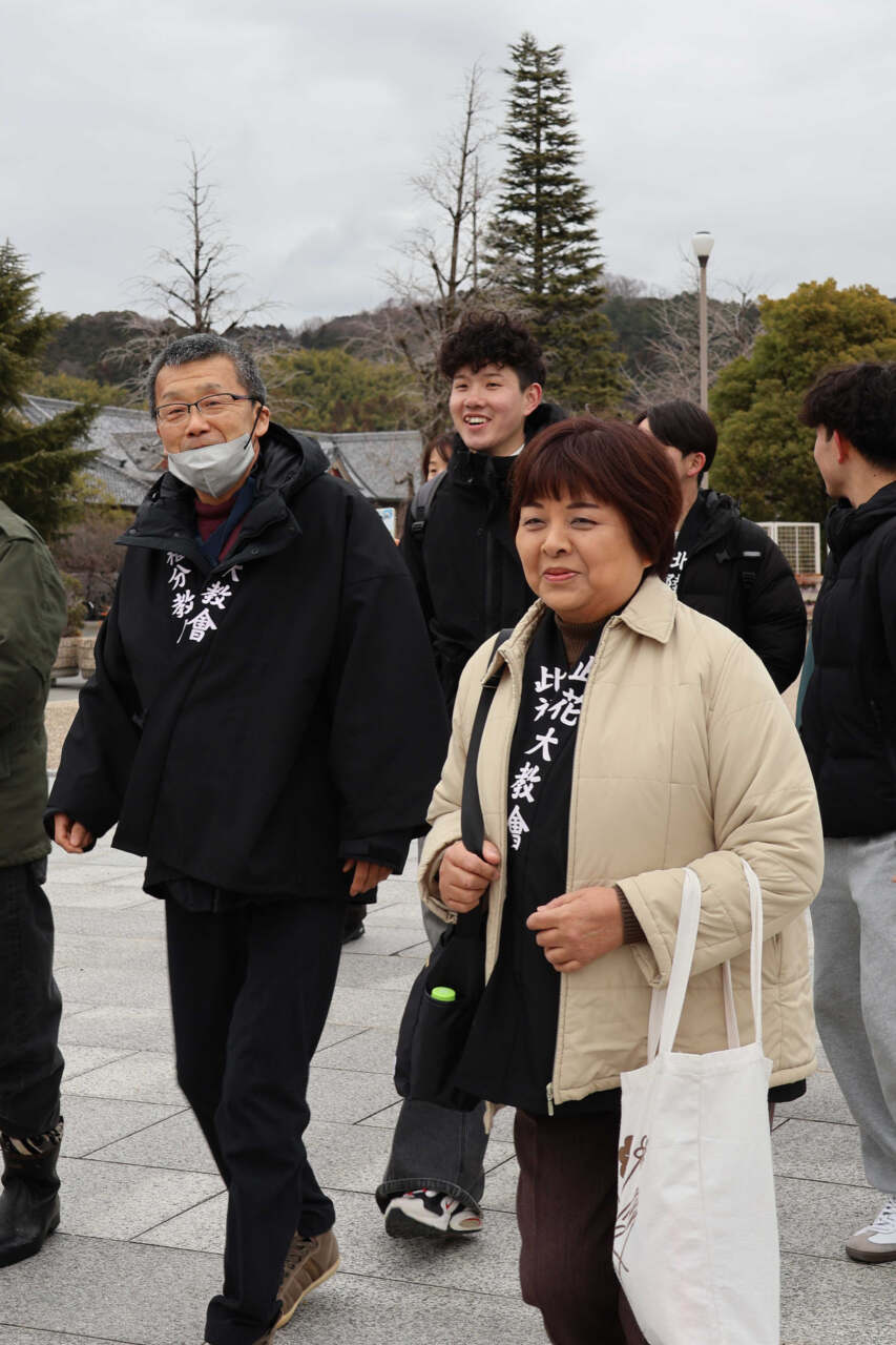 1月26日、西泉水プール前広場のパイプいすからおつとめを拝すのは、角居勝彦さん(61歳・鹿島大教会大輪布教所ようぼく・石川県輪島市)。この日、自身がようぼくへと導いた講談師の吉松洋一郎さん(52歳)夫妻と共に帰参した。