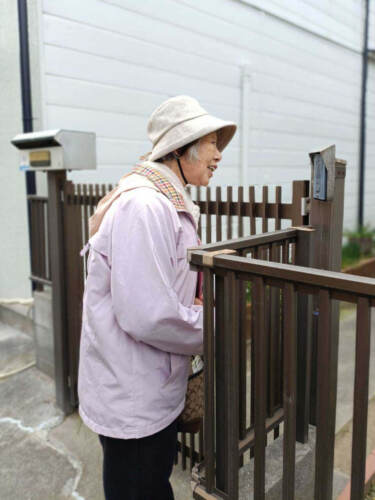 訪問した民家の住民に『天理いきいき通信』を手渡していたのは、伊原幸子さん(83歳・毎日分教会教人・明石市)。20年以上前から毎月、所属教会周辺の住宅地で『天理いきいき通信』180部を配布しているという。支部の実動日に参加するようになってからは、にをいがけ担当者の五百蔵和美さん(75歳・播淡分教会長)の布教熱心な姿に多くの学びを得ているという。