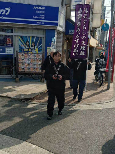 教祖140年祭の翌日であるこの日、尼崎市の園和公園に集合した教友たちは、神名流しをしながら園田駅へ。その後、駅前で路傍講演やリーフレット配りを行った。