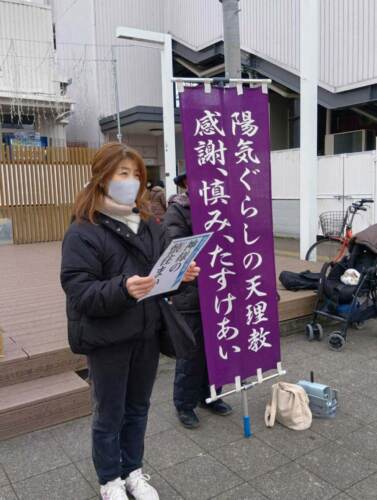 この日、駅前を行き交う人々に向けてお道の教えを語りかけていたのは、田中裕子さん(59歳・祖浪分教会教人・羽曳野市)。教祖140年祭へ向かう年祭活動2年目に「支部にをいがけ日」に参加するようになって以後、リーフレット配りを毎日続けているという。