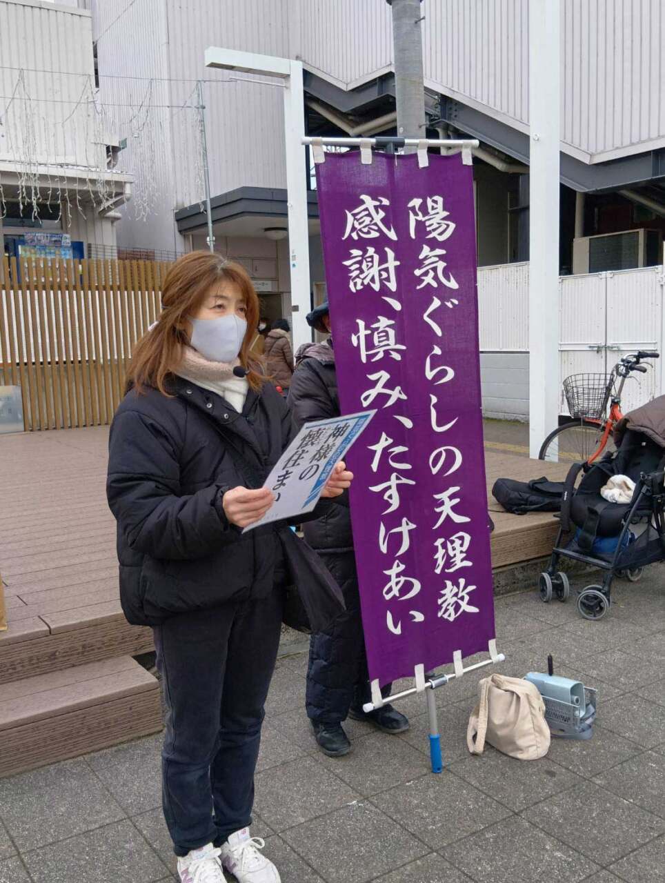 大阪教区阪南支部(丸山忠徳支部長)は1月28日、藤井寺市の近鉄藤井寺駅前ロータリーで実動。教友18人が路傍講演やリーフレット配りに取り組んだ。