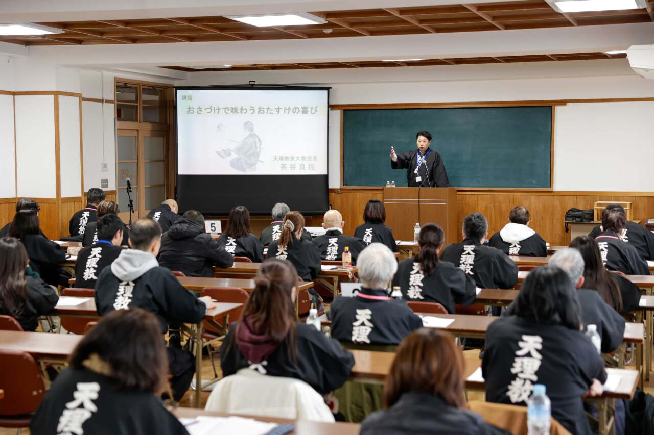 午後は、グループタイム「おさづけの取り次ぎ方」の後、茶谷良佐・泉大教会長が「おさづけで味わうおたすけの喜び」と題して講義。茶谷会長は、おさづけの理にまつわる自身の経験を話したうえで、おさづけを取り次ぐことによって教祖にお働きいただけるよう、日々心を耕していかなければならないと述べた。