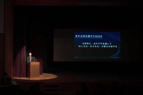 例会の席上、あいさつに立たれた中山大亮青年会長は、教祖140年祭が勤め終えられ、新たな歩みが始まったことを踏まえ、「これからのお道をつくっていく私たちにとって、この10年という期間は非常に大事な時期になる」と述べたうえで、青年会として目指すビジョンについて話を進められた。
