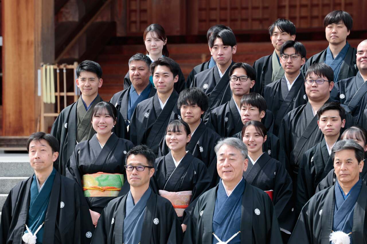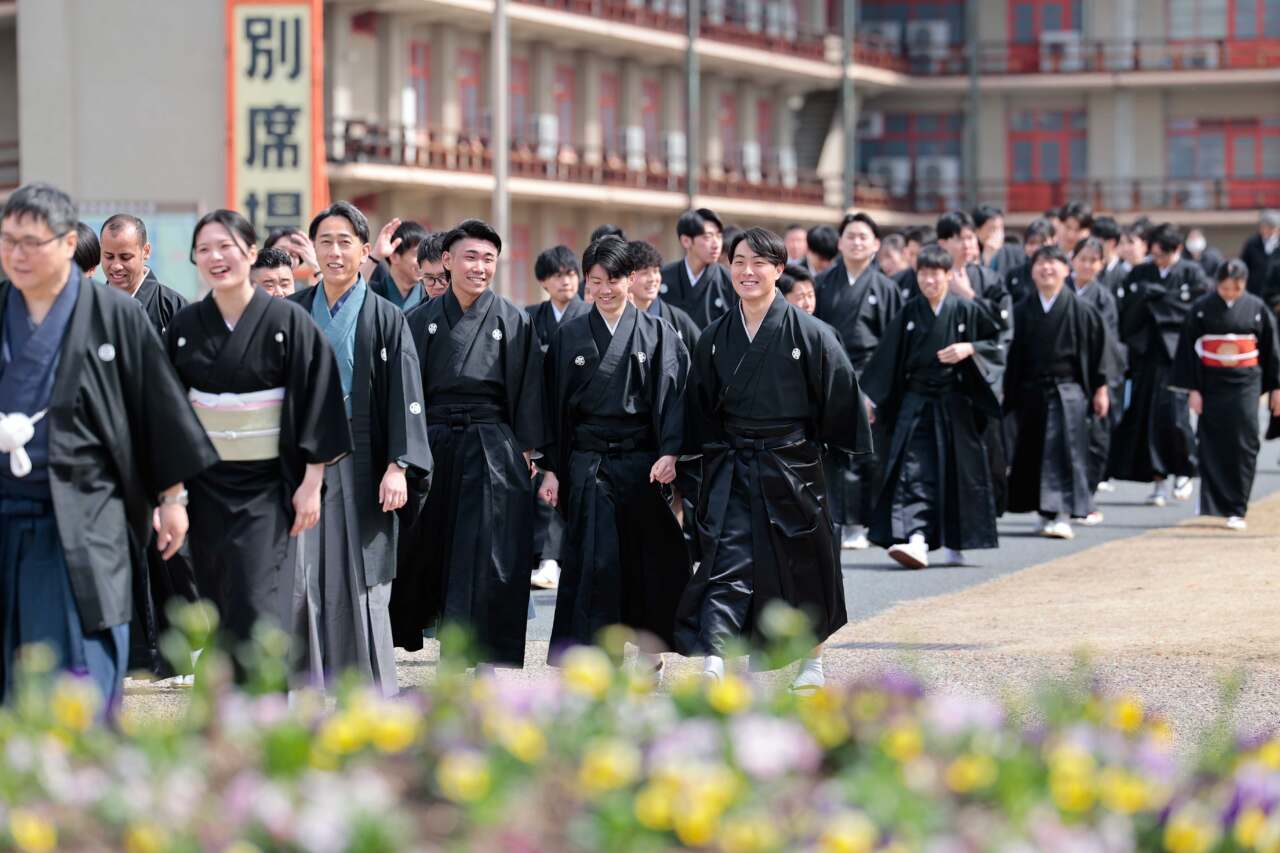 式後、春の訪れを感じる陽気のなか、卒業生たちは本部神殿へお礼参拝に向かった。