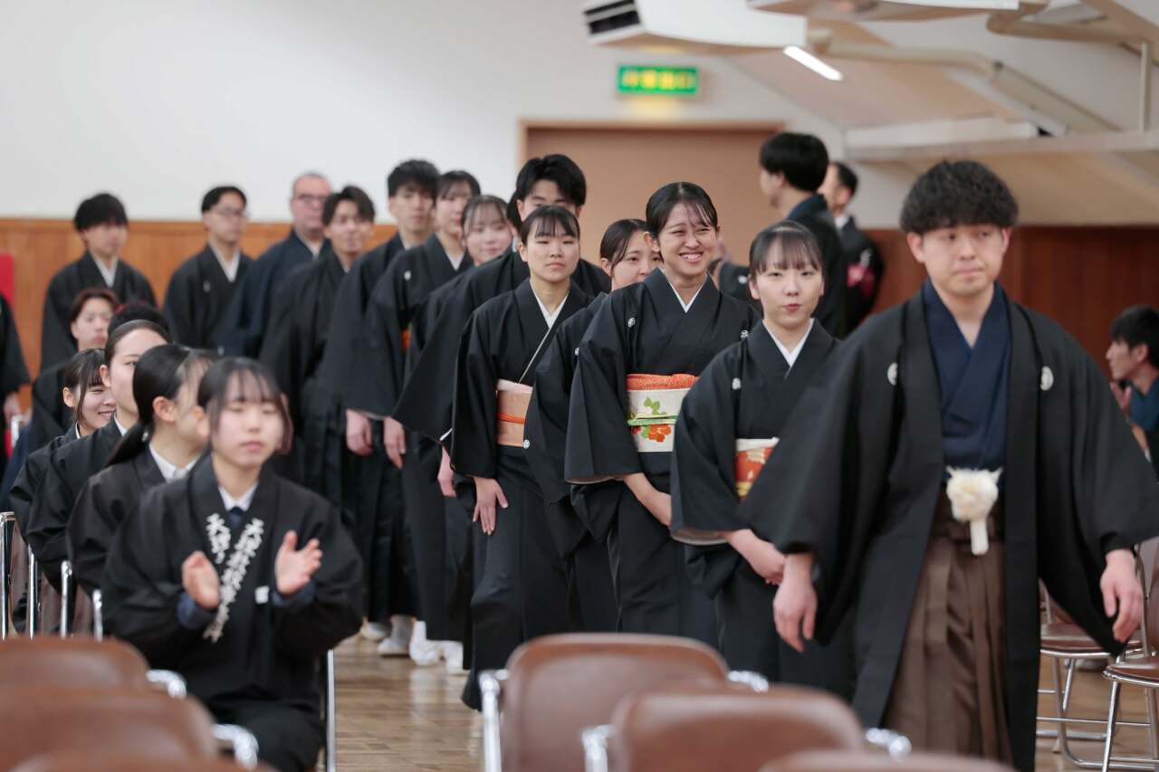 将来の道の中核を担う人材を育成する天理教校(永尾洋夫校長)は3月9日、真柱様、大亮様ご臨席のもと、おやさとやかた東右第1棟4階講堂で卒業式を挙行した。今年度の卒業生は本科研究課程2人、同実践課程10人、専修科24人の計36人。おつとめ衣姿で式に臨んだ。