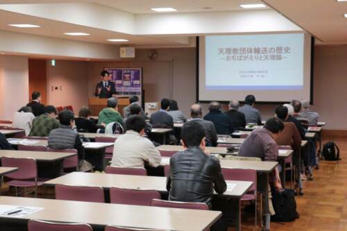 天理参考館(三濱靖和館長)の公開講演会「トーク・サンコーカン」が3月6日、同館研修室で開かれた。今回は、9日に閉幕した第100回企画展「教祖140年祭記念幕末明治の暮らし」の関連イベントとして、「天理教団体輸送の歴史――おぢばがえりと天理臨」をテーマに、乾誠二・学芸員が本教の団体輸送の歴史について詳しく解説した。