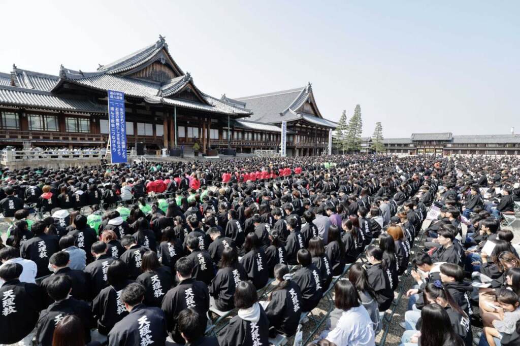 穏やかな春の日差しに包まれ、開花したサクラが親里を彩った当日。真柱奥様が臨席された式典には、全国の道につながる高校生・大学生ら3,748人が参集した。
