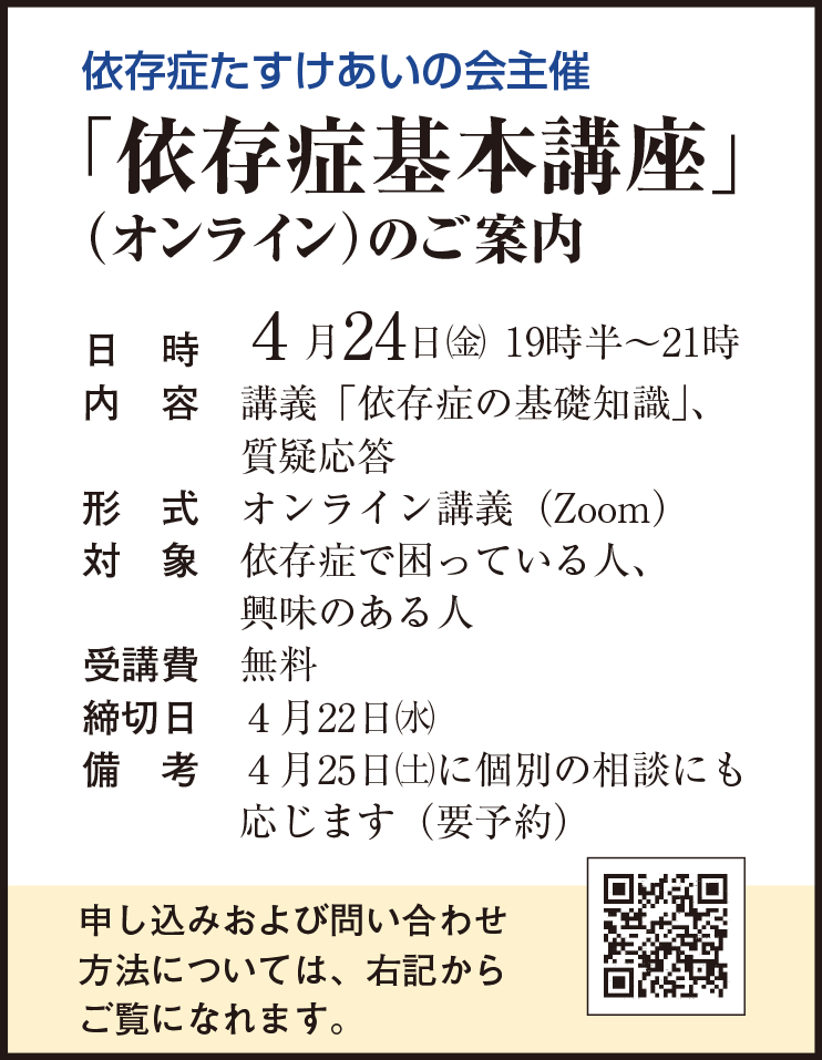 「依存症基本講座」(オンライン)のご案内(依存症の基礎知識)– 依存症たすけあいの会主催