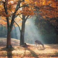 奈良公園飛火野。冷え込む早朝、カメラを構えていると朝の光が差し込み始めた。そこへ鹿が現れ、幻想的な風景となった。 by 藤浪秀明