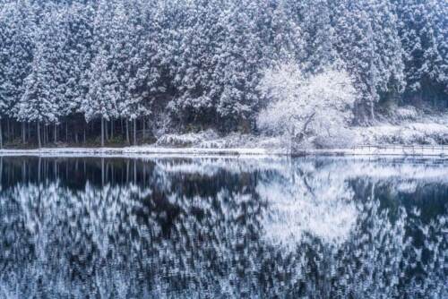 奈良県宇陀市龍王ヶ渕。無風の朝、深夜に降り積もった雪景色が鏡面世界を作り出した。陽光で雪が溶けだす一瞬の奇跡。 by 藤浪秀明